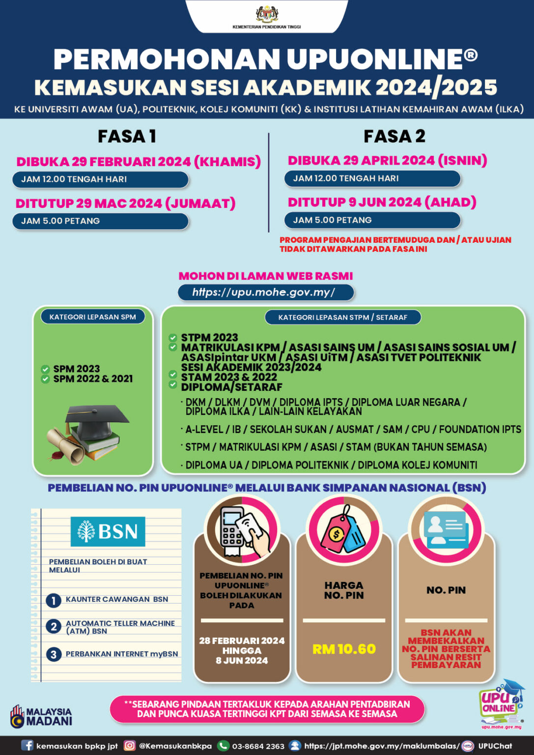 UPU Online 2024/2025 Langkah Permohonan dan Tarikh Penting , Maklumat permohonan upu bagi lepasan sijil pelajaran malaysia (spm) dan sijil tinggi persekolahan malaysia (stpm) untuk kemasukan ke.